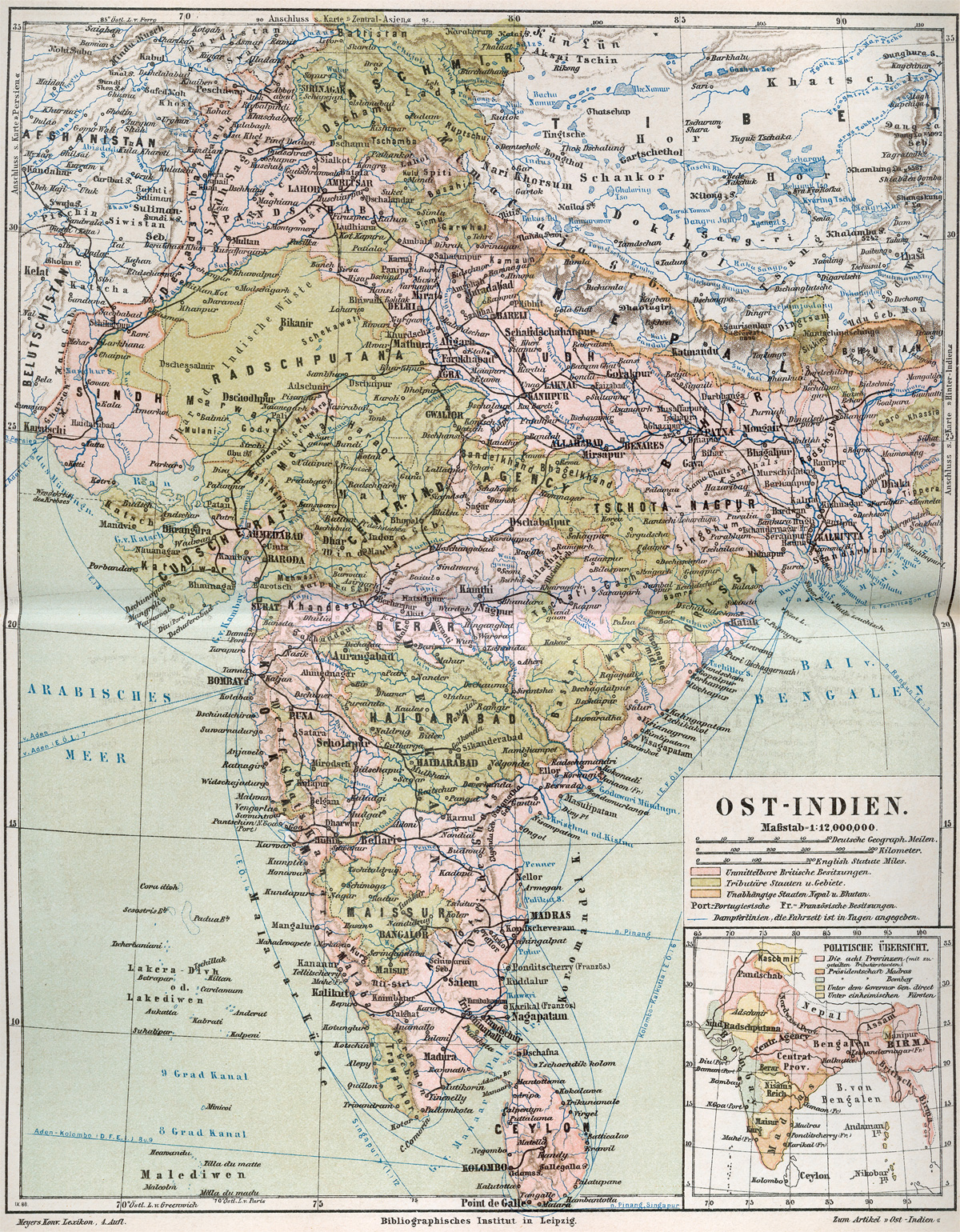 Unmittelbare Britische Besitzungen. Tributäre Staaten und Gebiete. Unabhängige Staaten Nepal u. Bhutan. Port.-Portugiesische Fr.-Französische Besitzungen. Dampferlinien, die Fahrzeit ist in Tagen angegeben.